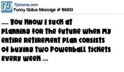 - # 167497 ... I think it's sad that my retirement plan consists of buying a lottery ticked every week. But when I DO win ... I am totally retiring!