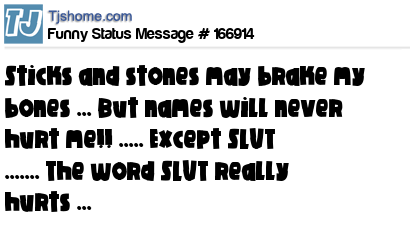 X Sticks and stones may brake my bones ... But names will never hurt me!! ..... Except SLUT ....... The word SLUT really hurts ...