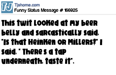 X says This twit looked at my beer belly and sarcastically said, "Is that Heinken or Millers?" I said, " There’s a tap underneath, taste it".
