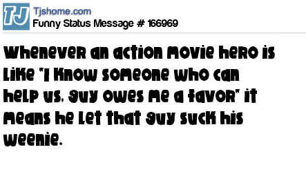 X says Whenever an action movie hero is like "I know someone who can help us, guy owes me a favor" it means he let that guy suck his weenie.