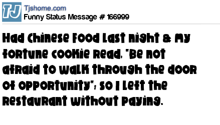 X says Had Chinese Food last night & my fortune cookie read, "Be not afraid to walk through the door of opportunity"; so I left the restaurant without paying.