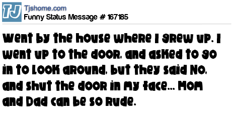 X says Went by the house where I grew up. I went up to the door, and asked to go in to look around, but they said No, and shut the door in my face... Mom and Dad can be so rude.