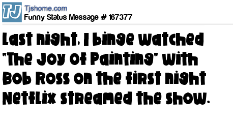 X says Last night, I binge watched "The Joy Of Painting" with Bob Ross on the first night Netflix streamed the show.