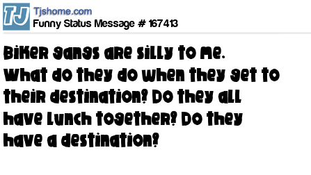 X says Biker gangs are silly to me. What do they do when they get to their destination? Do they all have lunch together? Do they have a destination?