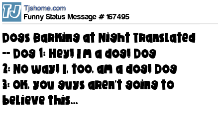 X says Dogs Barking at Night Translated -- Dog 1: Hey! I’m a dog! Dog 2: No way! I, too, am a dog! Dog 3: Ok, you guys aren't going to believe this...