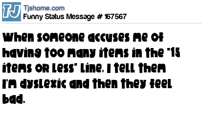X says When someone accuses me of having too many items in the "15 items or less" line, I tell them I'm dyslexic and then they feel bad.