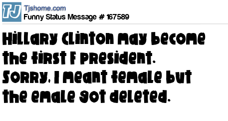 - # 172004 If Hillary becomes president she will be the first F President. Oh, sorry. I was going to say female, but the "emale" got deleted.