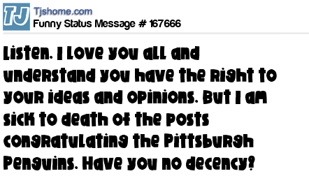 X Listen. I love you all and understand you have the right to your ideas and opinions. But I am sick to death of the posts congratulating the Pittsburgh Penguins. Have you no decency?