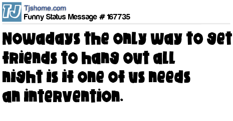 X says Nowadays the only way to get friends to hang out all night is if one of us needs an intervention.