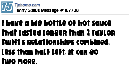 X says I have a big bottle of hot sauce that lasted longer than 2 Taylor Swift's relationships combined. Less than half left, it can go two more.