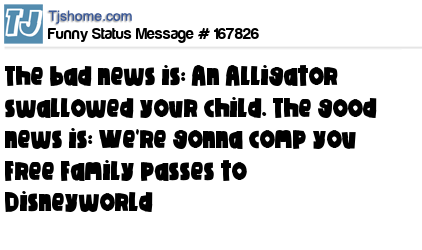 X says The bad news is: An Alligator swallowed your child. The good news is: We're gonna comp you Free Family passes to Disneyworld