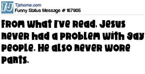 X says From what I've read, Jesus never had a problem with gay people. He also never wore pants.
