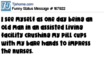 X says I see myself as one day being an old man in an assisted living facility crushing my pill cups with my bare hands to impress the nurses.