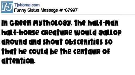 X says In Greek mythology, the half-man half-horse creature would gallop around and shout obscenities so that he could be the centaur of attention.