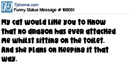 X says My cat would like you to know that no dragon has ever attacked me whilst sitting on the toilet. And she plans on keeping it that way.