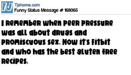X says I remember when peer pressure was all about drugs and promiscuous sex. Now it's Fitbit and who has the best gluten free recipes.