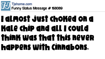 X says I almost just choked on a kale chip and all I could think was that this never happens with Cinnabons.