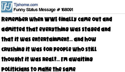 - # 208484 Remember WWE admitted everything was staged entertainment? I'm waiting for politicians to make the same announcement.