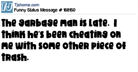 X says The garbage man is late. I think he's been cheating on me with some other piece of trash.