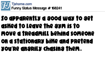 - # 131383 Apparently a good way to get asked to leave the gym is to move a treadmill behind someone on a stationary bike and pretend you're angrily chasing them.