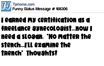 X says I earned my certification as a freelance gynecologist...now I need a slogan. "No matter the stench...I'll examine the trench" Thoughts?