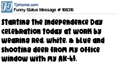 X says Starting the Independence Day celebration today at work by wearing red, white, & blue and shooting deer from my office window with my AK-47.