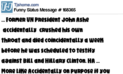 X ... Former UN President John Ashe “accidentally” crushed his own throat and died coincidentally a week before he was scheduled to testify against Bill and Hillary Clinton. HA ... More like Accidentally on purpose if you ask me!!!