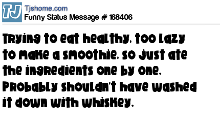 X says Trying to eat healthy, too lazy to make a smoothie, so just ate the ingredients one by one. Probably shouldn't have washed it down with whiskey.