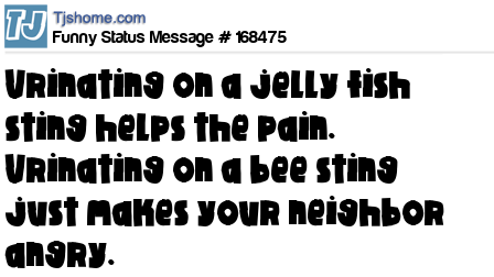 - # 103314 Found out today you're supposed to urinate on a jellyfish sting, not a jelly stain. Sorry lady at waffle house... just trying to help.