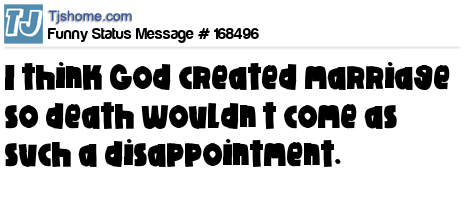 - # 195586 Should say in that religious book.. The Reason God created marriage.. So death wasn't so disappointing.