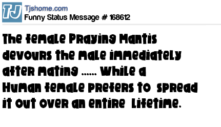 X The female Praying Mantis devours the male immediately after mating ...... While a Human female prefers to spread it out over an entire lifetime.