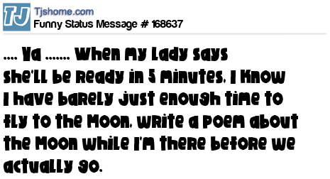 X .... Ya ....... When my lady says she'll be ready in 5 minutes, I know I have barely just enough time to fly to the Moon, write a poem about the Moon while I'm there before we actually go.