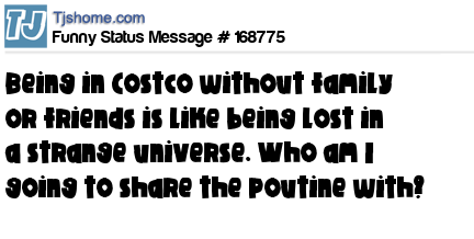 X says Being in Costco without family or friends is like being lost in a strange universe. Who am I going to share the poutine with?