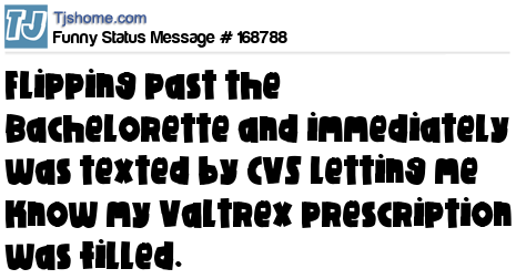 X says Flipping past the Bachelorette and immediately was texted by CVS letting me know my Valtrex prescription was filled.