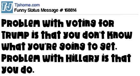 X Problem with voting for Trump is that you don't know what you're going to get. Problem with Hillary is that you do.
