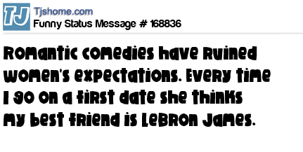 X says Romantic comedies have ruined women's expectations. Every time I go on a first date she thinks my best friend is LeBron James.