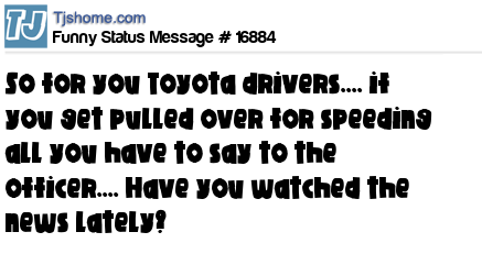 X so for you Toyota drivers.... if you get pulled over for speeding all you have to say to the officer.... Have you watched the news lately?