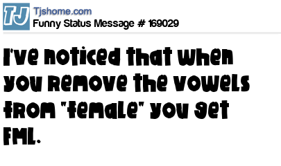 - # 133974 Did you ever notice that when you remove the vowels from "female" you get FML?