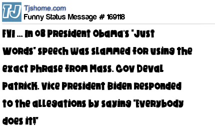 X FYI ... In 08 President Obama's "Just Words" speech was slammed for using the exact phrase from Mass. Gov Deval Patrick. Vice President Biden responded to the allegations by saying "Everybody does it!"