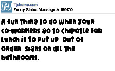 X says A fun thing to do when your co-workers go to Chipotle for lunch is to put up “Out of Order” signs on all the bathrooms.
