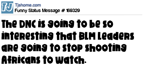 - # 169355 The Democrat National Convention is going to be so interesting that Black Lives Matter memboers are even going to stop shooting Cops to watch it.