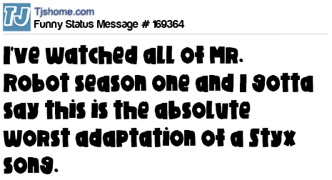 X says I've watched all of Mr. Robot season one and I gotta say this is the absolute worst adaptation of a Styx song.