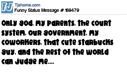 X says Only god, my parents, the court system, our government, my coworkers, that cute starbucks guy, and the rest of the world can judge me....