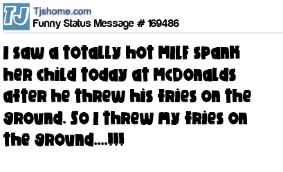 X says I saw a totally hot MILF spank her child today at McDonalds after he threw his fries on the ground. So I threw my fries on the ground....!!!