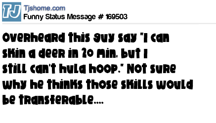 X says Overheard this guy say "I can skin a deer in 20 min, but I still can't hula hoop." Not sure why he thinks those skills would be transferable....