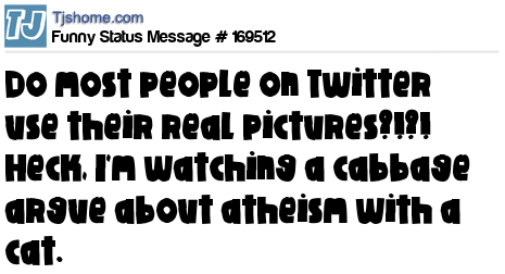 X says Do most people on Twitter use their real pictures?!?! Heck, I'm watching a cabbage argue about atheism with a cat.