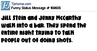 X says Jill Stein and Jenny McCarthy walk into a bar. They spend the entire night trying to talk people out of doing shots.