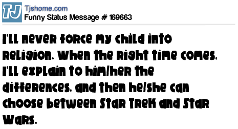 X says I'll never force my child into religion. When the right time comes, I'll explain to him/her the differences, and then he/she can choose between Star Trek and Star Wars.