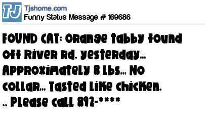 X says FOUND CAT: Orange tabby found off River rd. yesterday,,, Approximately 8 lbs,,, No collar,,, Tasted like chicken. .. Please call 892-****