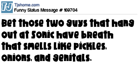X says Bet those two guys that hang out at Sonic have breath that smells like pickles, onions, and genitals.